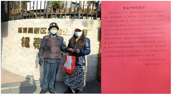 4月11日,市保安公司高新區(qū)銀泰城幼兒園項(xiàng)目部保安隊(duì)員王永上班路上撿到手提袋一個(gè),四處找尋無果后,打開查看包內(nèi)有手機(jī)和少量現(xiàn)金,通過電話聯(lián)系找到失主,最終歸還遺失物品。失主家人拿到失而復(fù)得的財(cái)物后,十分激動(dòng)并專門送上感謝信對其表示感謝。